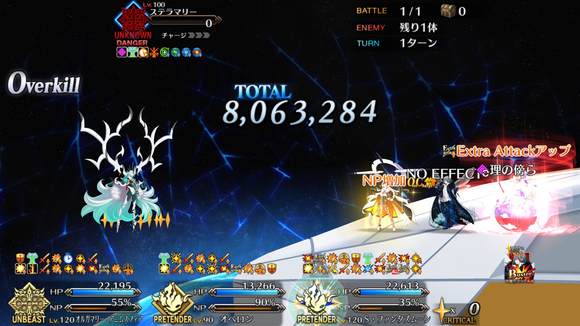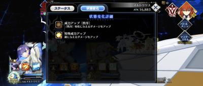 初めてノクナレア使ったけど強い強い言われてた理由がよくわかるくらいにはバフすごいねこの女王……。一回ファンタが耐魔力B持ってるせいか弱体バフ弾いちゃったら100万近くダメージに差が出たし