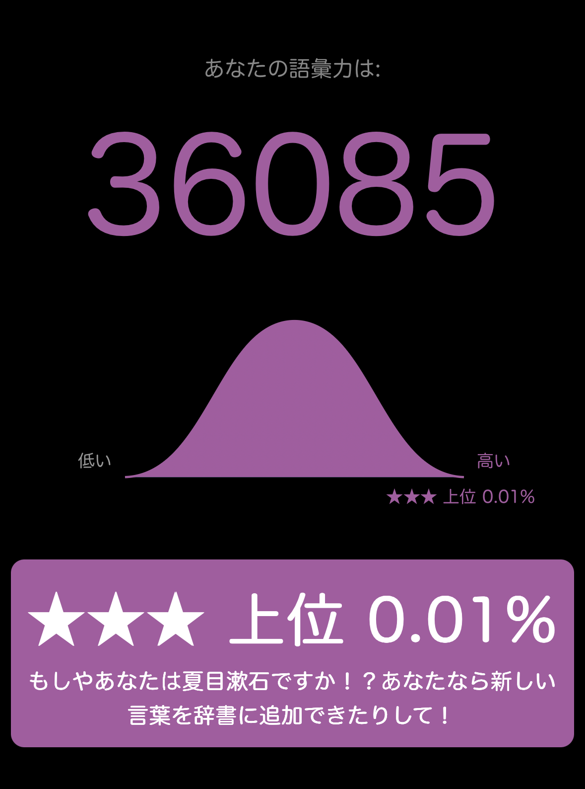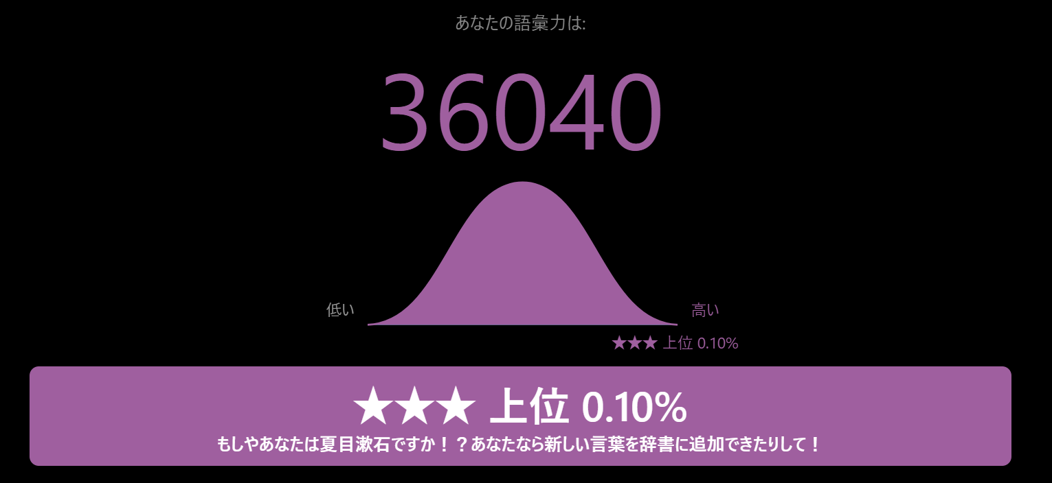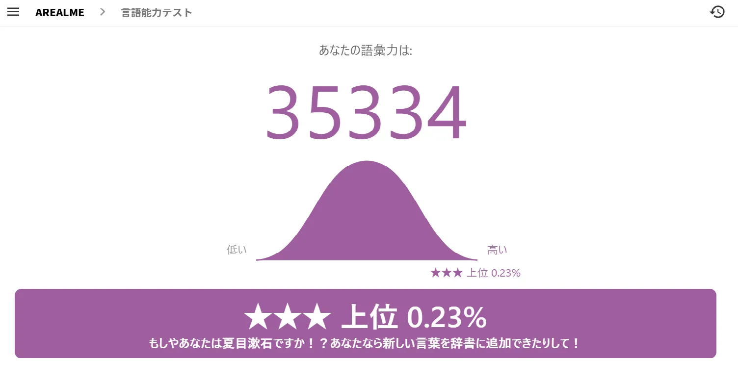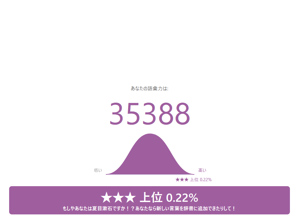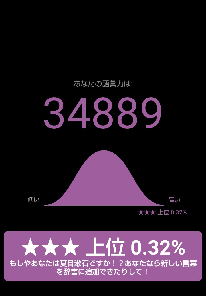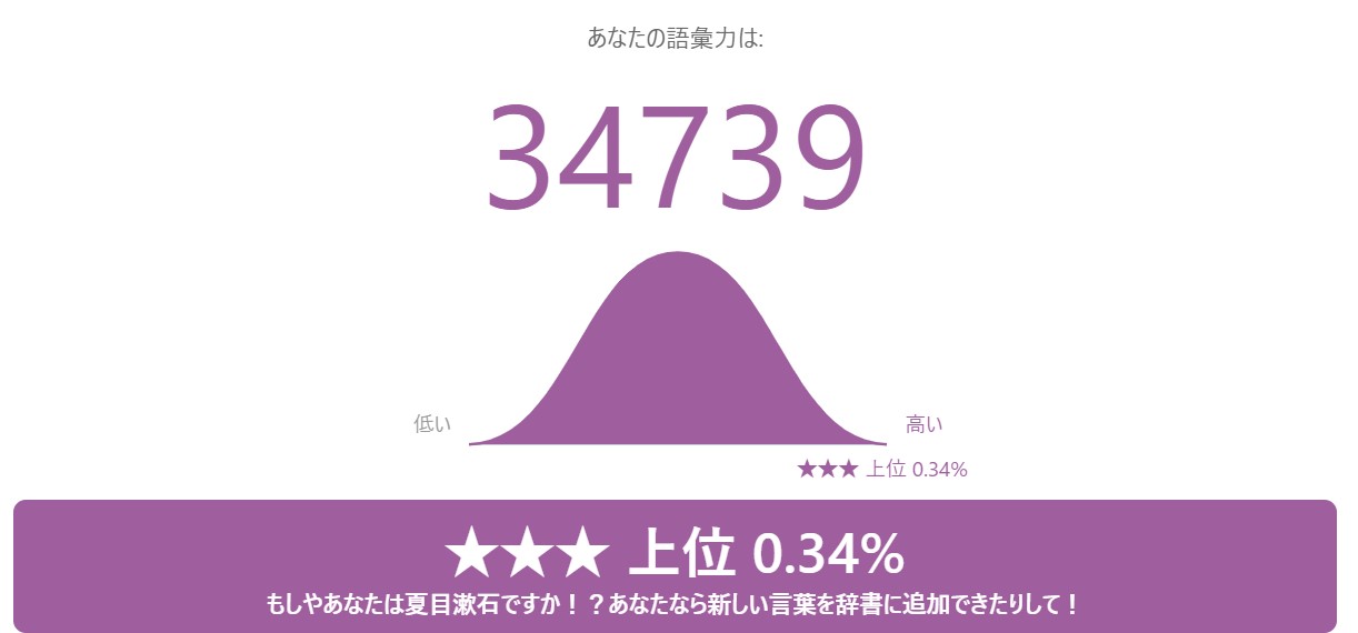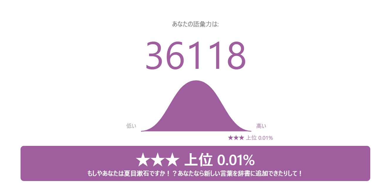 日本語ボキャブラリーテスト簡単な質問に答えて語彙力をあなたの語彙力を確かめてみましょう!登録ナシ!www.arealme.comそしてこれが幽玄のテスト結果
