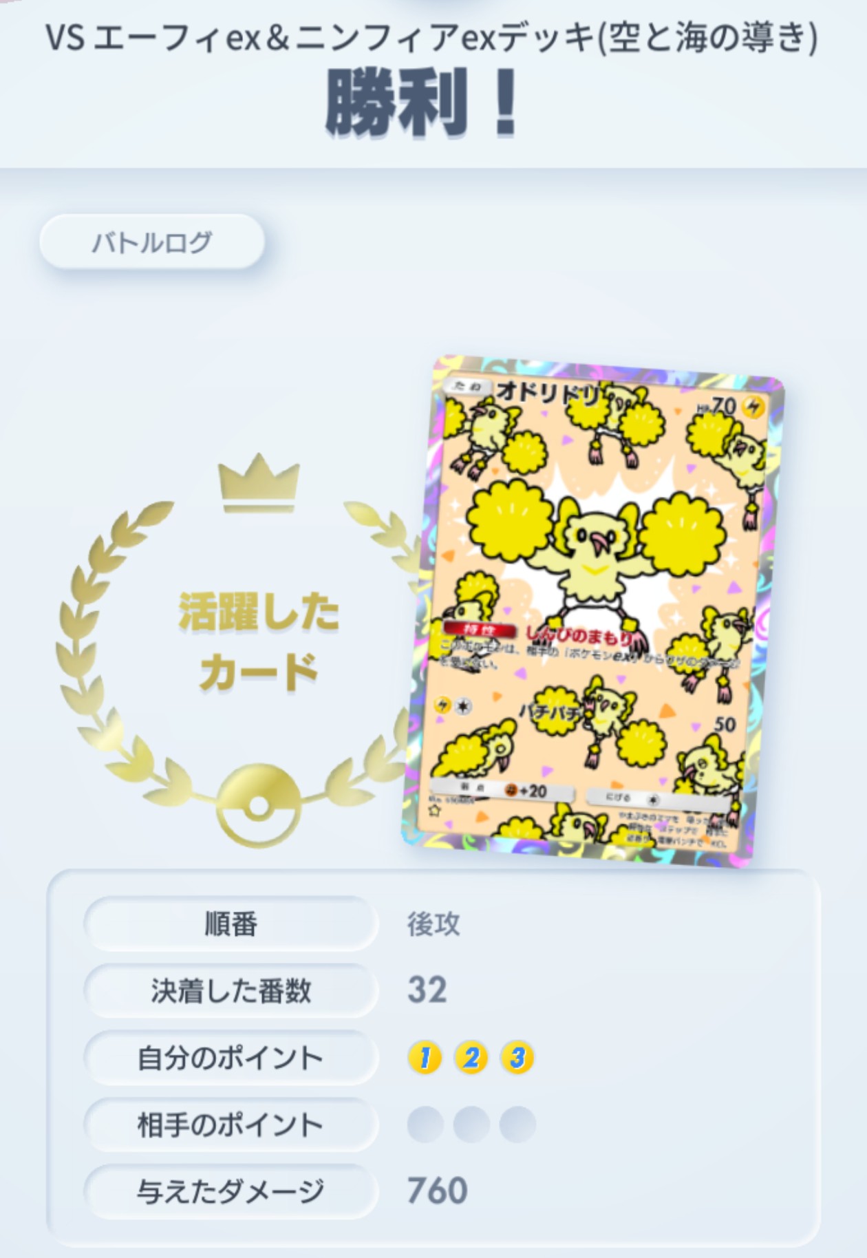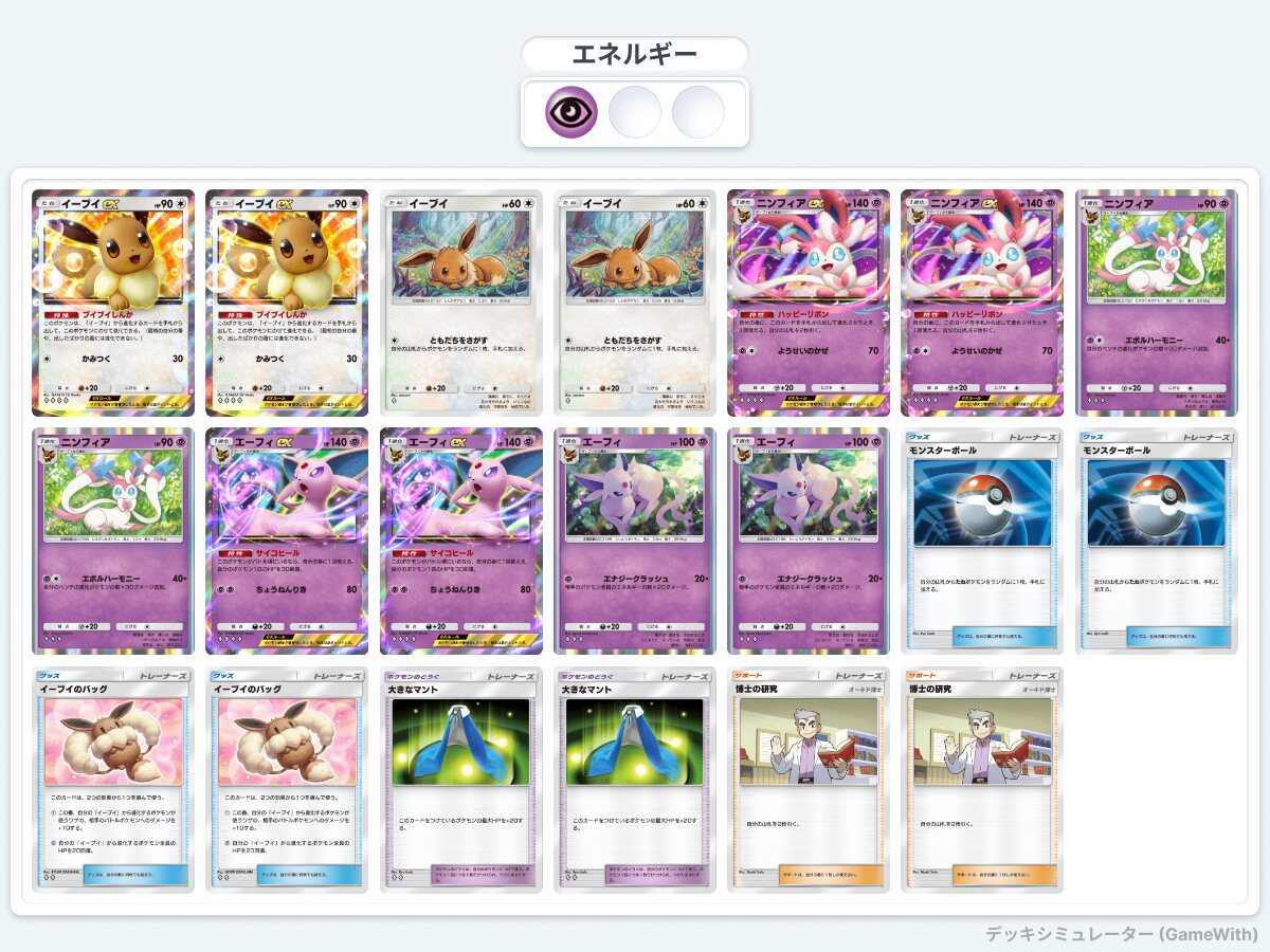 使ってて思うのがエーフィexが意外と使うの難しいと思いましたヒール能力は強力だけどバトル場にいなきゃいけないし打点もあまり無くHPも高くは無い上にexなのでコスト2なのも頭を悩ませます