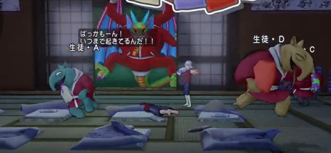 宿に泊まると急に修学旅行の夜みたいなシチュエーションで枕投げが始まる。熱血シドー先生はお邪魔キャラとして登場