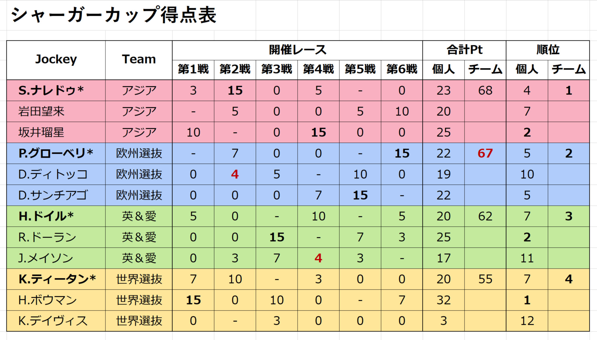各着順につき以下のポイントを獲得でき、獲得ポイントの合計で競う