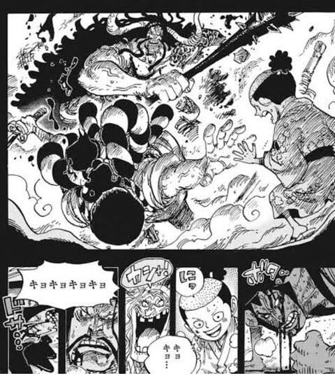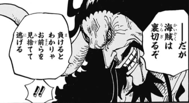 このシーンでキングや周りの部下達は(誰なんだこのババアは?馴れ馴れしくカイドウさんと喋ってるが・・・)って思ってるんだろうなぁ