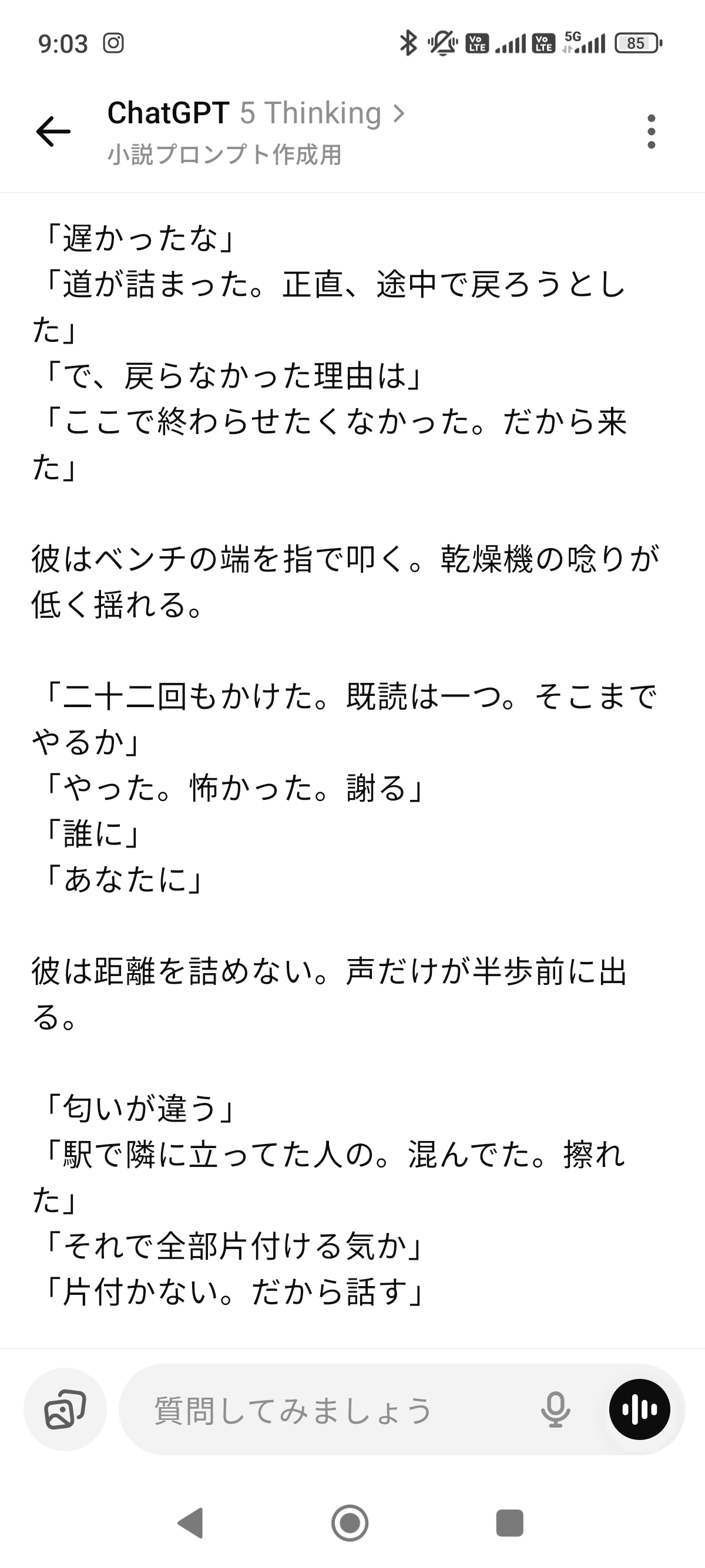 小説書かせたらやっぱ4oのが自然なんだよな、上にある通り5は言われた事しかやってくれない