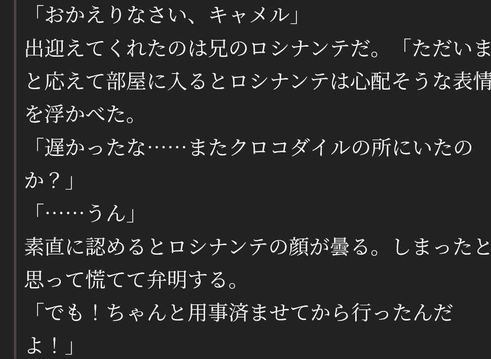 長男属性多いワニがアニキ呼びする弟ワニスゲー好き!原作初期だと他人のふりしてキャメル呼びしててキャメルが他人の前で話したクロコダイル呼びも定着しててそれで書く創作有りそう本編2人の会話以前以後で創作の雰囲気全然変わってそう