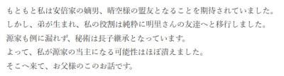 ふうん聖ボーとは婚約したがそれはあくまで家のメンツを考えただけで聖ボーと交流するより安倍家の教育を優先してるということか