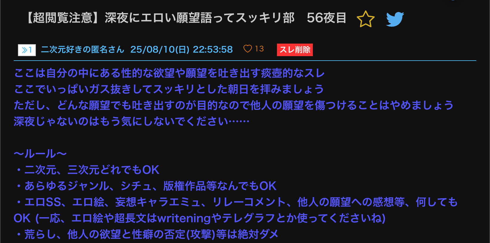 【超閲覧注意】深夜にエロい願望語ってスッキリ部 56夜目|あにまん掲示板ここは自分の中にある性的な欲望や願望を吐き出す痰壺的なスレ ここでいっぱいガス抜きしてスッキリとした朝日を拝みましょう ただし、どんな願望でも吐き出すのが目的なので他人の願望を傷つけることはやめましょ…bbs.animanch.com - 3二次元好きの匿名さん25/08/14(木) 01:27:36