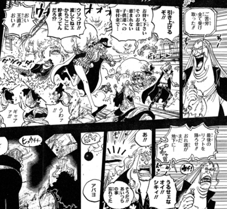 見る限りニューゲート、カイドウ、凶?かなが地下の財宝を上に運んでシキが地下班を回収する役目なのに忘れていた上に爆弾投げた感じだな