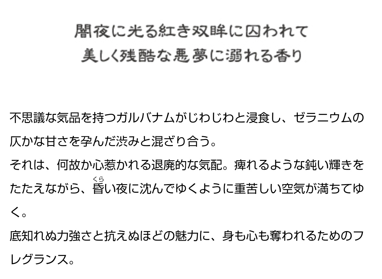 ロマンチックな文章があるのは、制作スタッフの理解度ととか知れてすごくいいんだが、それはそうとて具体的な香りの種類書いてくれ...