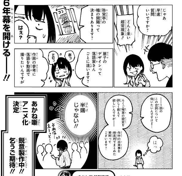 あかね噺の両先生はアニメ化コメント出してるから次に巻末で触れるのは先になってもおかしくないのでは