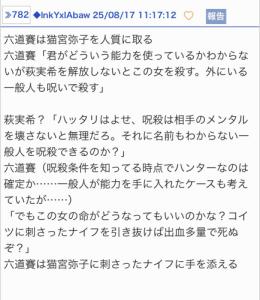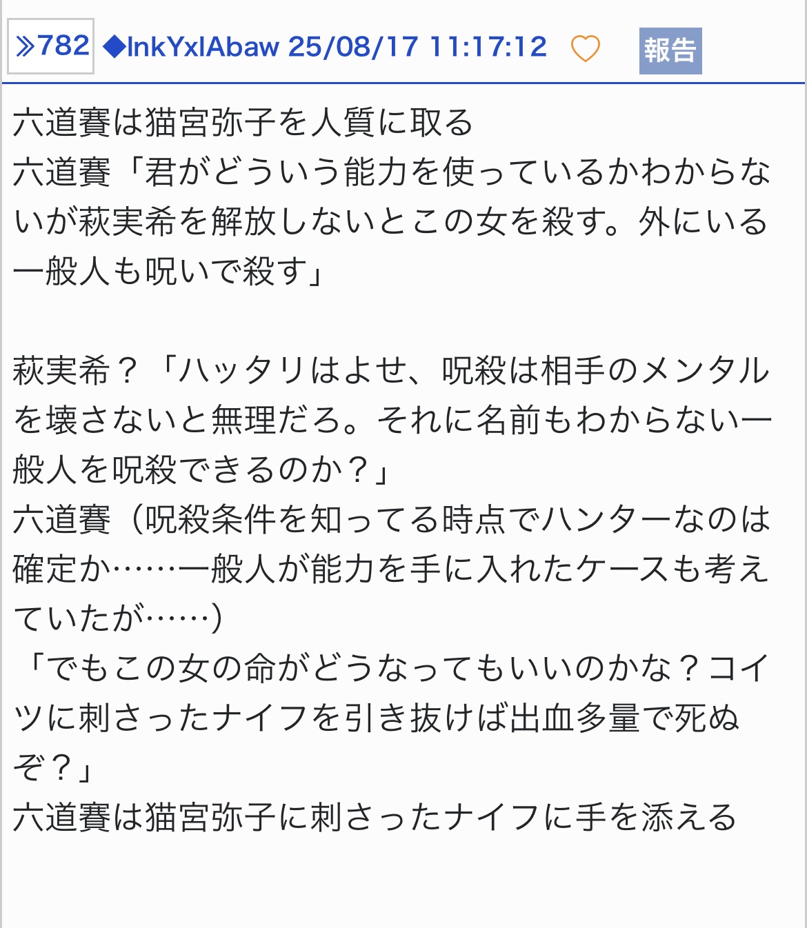 信森 知紗「絶対無理、その子もう死んでる。だってあなたを利用して殺そうとしたんでしょ?敵には明確な殺意があった。おそらくその猫宮弥子って子はプレイヤー、もしくはハンター。殺さない理由が無い」 - 28◆lnkYxlAbaw25/08/18(月) 23:17:21