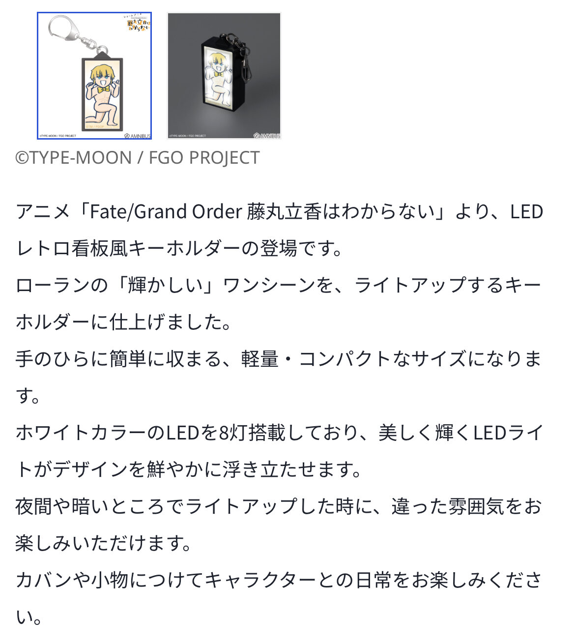 アニメ「Fate/Grand Order 藤丸立香はわからない」 - ローラン 場面写LEDレトロ看板風キーホルダー | AMNIBUS(アムニバス)AMNIBUS(アムニバス)はアニメ・ゲーム・マンガのコラボグッズショッピングサイト。毎日楽しく使える、色々な作品のオリジナル商品を受注生産式で予約・購入していただくことができます。amnibus.com - 17二次元好きの匿名さん25/08/19(火) 12:54:26
