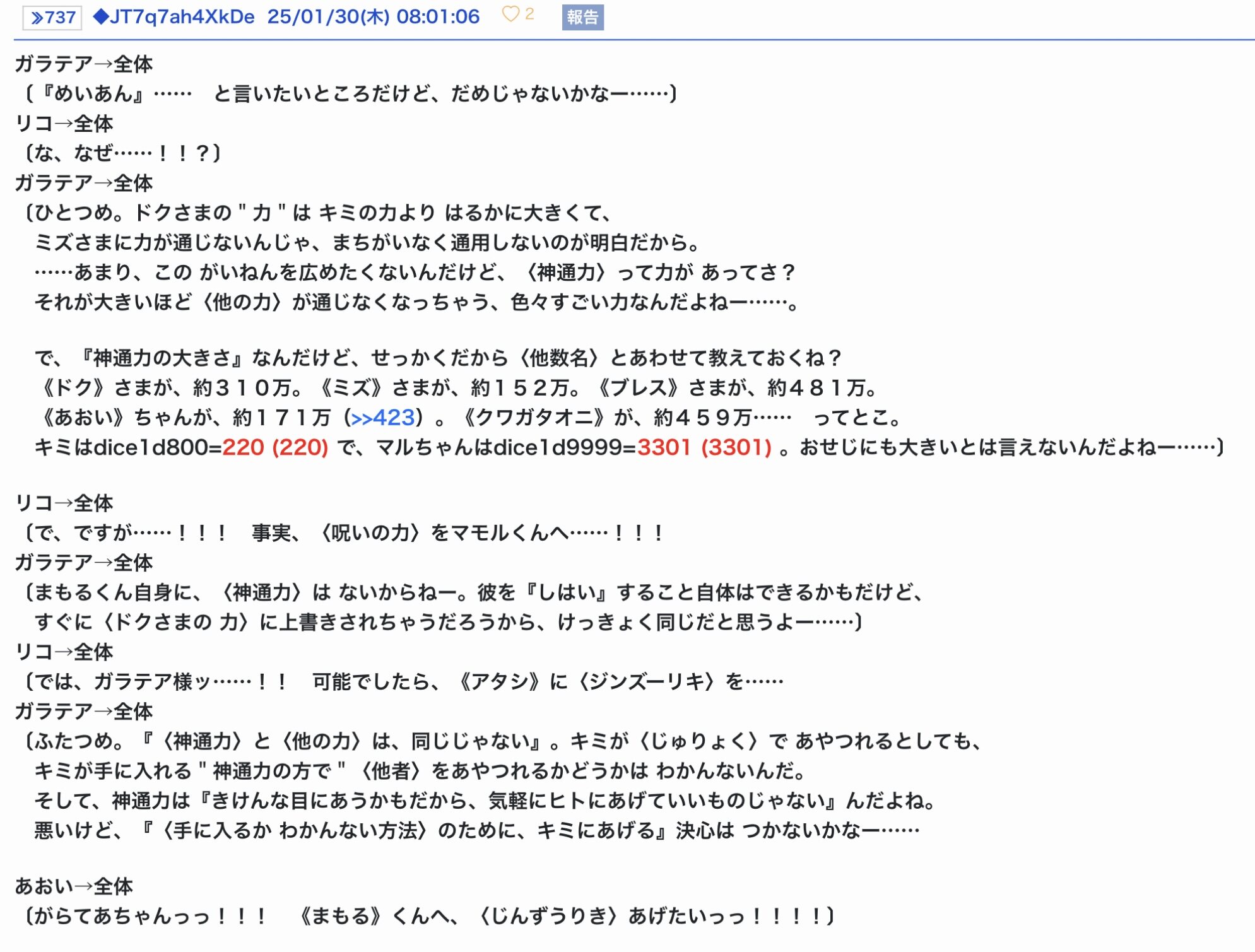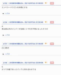 äºç« ïŒæ¬¡ã¹ã¬ïŒã®åé ã§ã¯ããäž»èŠäººç©ïŒåïŒ+æ°åïŒã®ãã¡ãïŒè©±åŸç·šäžã§ã®æŽ»èºã