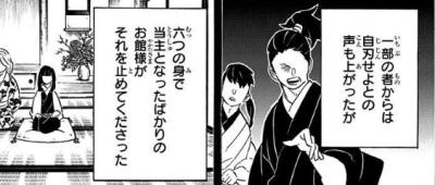 鬼の解体を趣味とする雷の隊士によって執拗な拷問を受けたことにより精神崩壊するも、冨岡義勇によって介錯されて無事に死亡し死後は両親に再会する