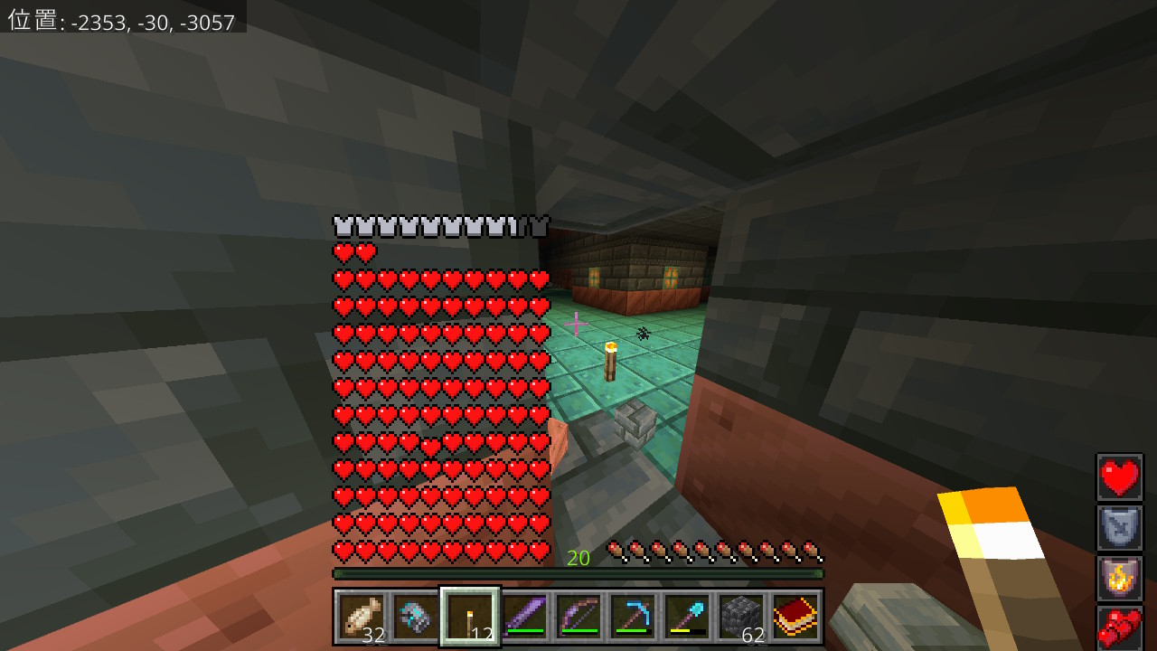 昨日寝る前にやってたとき遠くまで探索しに行って死んだあと回収に頑張って行ったらもう一回死んだ上にクリーパーの爆発で一部ロストしたのが俺なんだよね
