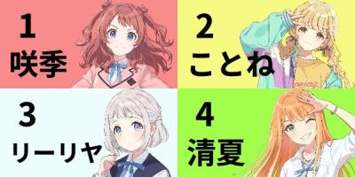 咲季:学Pに喧嘩を売られ学Pと星南の担当アイドル全員を倒す事を目標にしており、四月のHIF選抜試験では燐羽に次ぐ二位だった