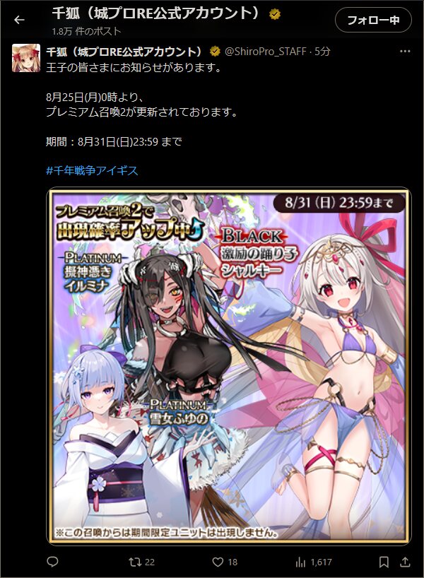 初期のガチャ白…聞いています 早めに恒常から除外されたので未だに未所持がちらほら居ると