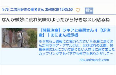 深夜だからこのまま落ちるだろうけど、スレ主、削除より通報なんて悠長なこと言ってられないよ