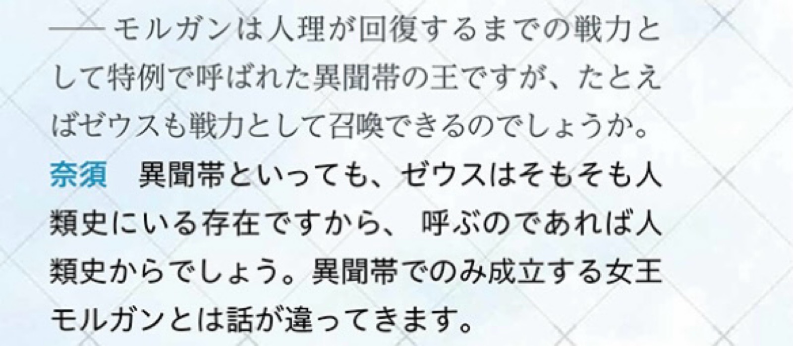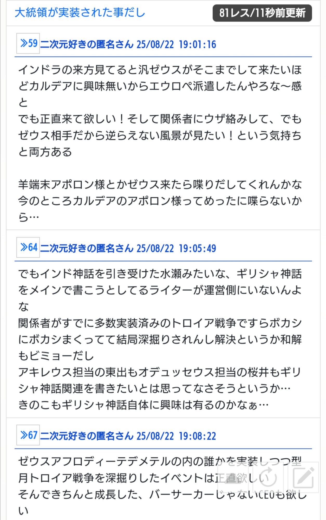 他の異聞帯の王は全員実装されてるのにゼウスは匂わせすら無い所見るとそもそも実装する気が無いんだろ