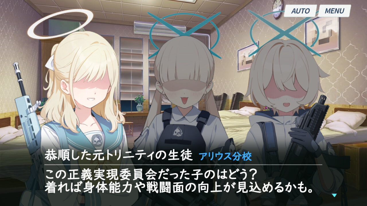 恭順を決意したトリニティの生徒たちはアリウス生同様ベアトリーチェによる教義と戦闘訓練を施され、彼女の新たな兵士兼手駒として育成されていく