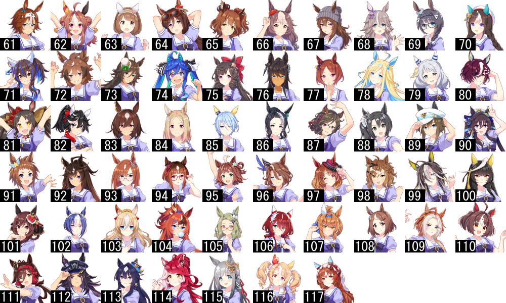 番号は「トレセン学園生徒紹介」のもの(テイエムオペラオーとミホノブルボンが初期組に紛れ込んでいる以外は実装順と一致)を参照しています。