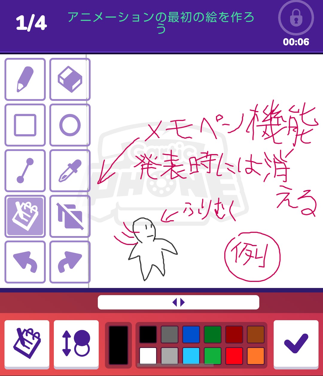 2番手がその上に絵を描いて、3番手以降はアニメーションモード同様に「次に起こる絵」を描いて、アニメーションを完成させる伝タフ