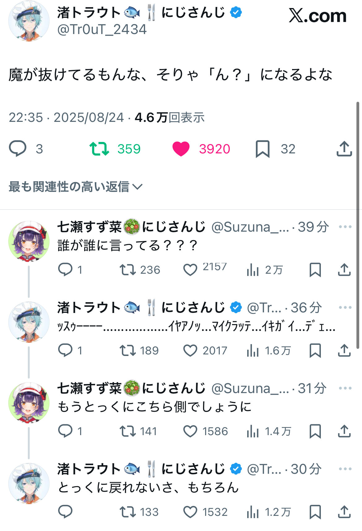 夢追さんも確かちょますことやったamazarashi歌枠の振り返り雑談で渚トラウトも引き込みたいみたいな事言ってたし。 - 78二次元好きの匿名さん25/08/30(土) 00:11:48