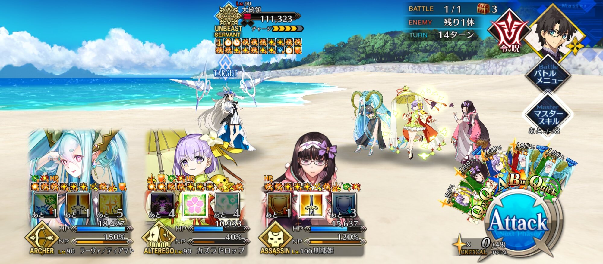 サマーパワーの名目で宝具威力アップとクリティカル威力アップが大統領に累積していくのはかなり怖かったですが、