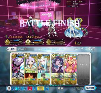 総経過ターン14、>>1の画像のあと宝具3連チェインを行い、カズラの宝具でフィニッシュ