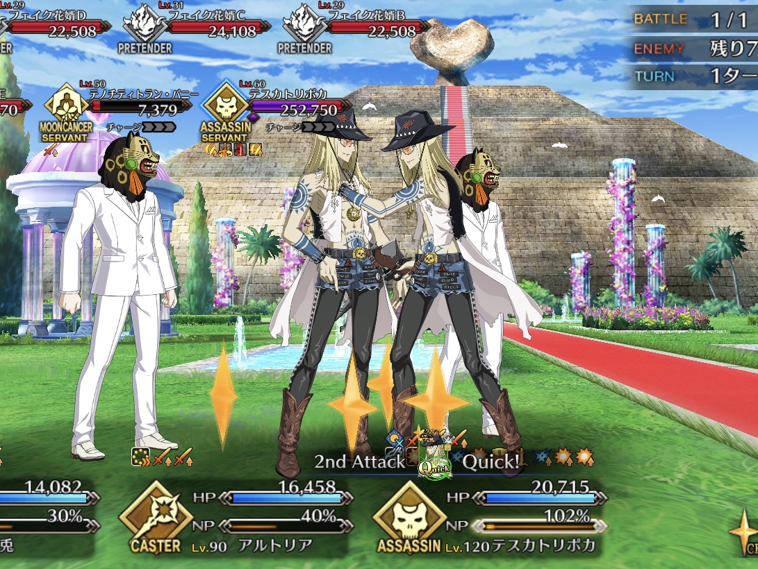 稀にしかやってくれないからいまだに写真撮れてないんだけどテスカトリポカのQカード使った時に敵の腹に銃口当ててはいおはようさんって言いながらぶっ放すやつ