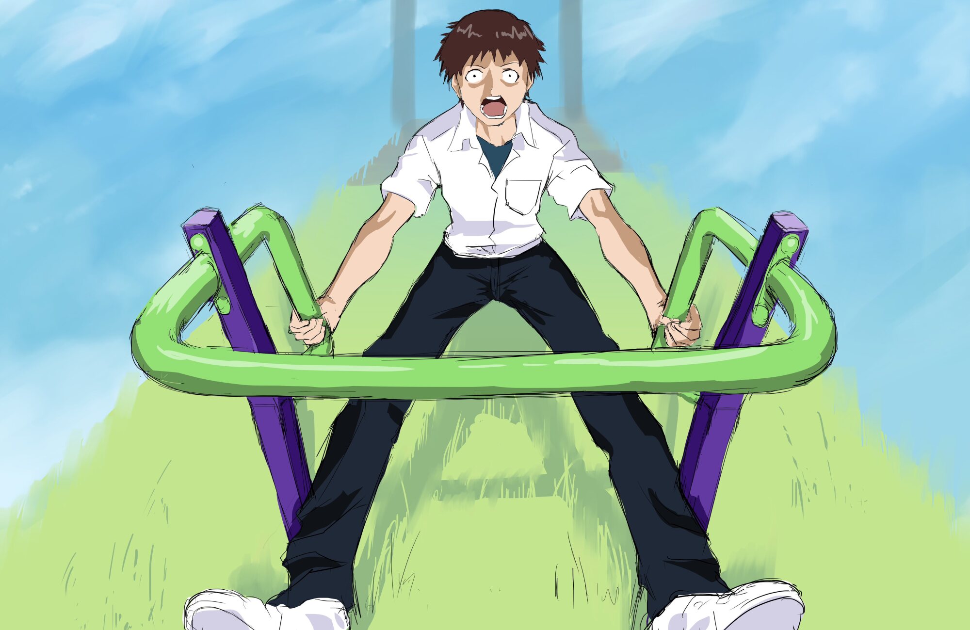 おそらくこの遊具の構造とシンジ君の体勢から考えて足を浮かせててキツいからだと思われるが…