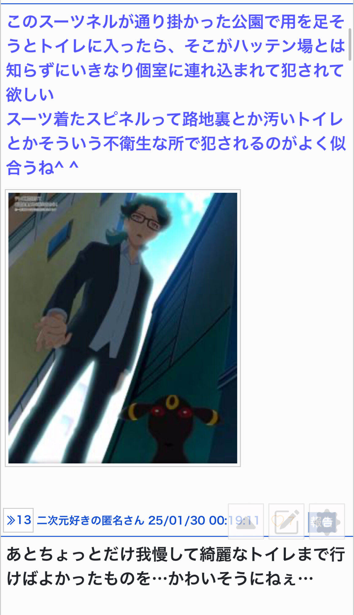 (アンチスレ等を確認した場合は、速やかにお問い合わせフォーム等を通じて通報を行い、その後は一切反応せず、無視してください) - 5二次元好きの匿名さん25/09/01(月) 11:03:53