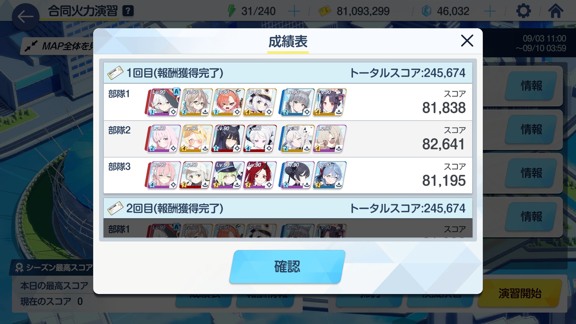 編成3は完全体ハナコにバフ重めに積んで1射-1射-2射で終わらす編成で、1wはコスト待ちの間に削れるのでバフ薄くていいが連射のため3枚積んで1w2w連射、2w後乗せでアコ、3wはバフ積み直して2射して80000点弱ぐらいのはずだが、大きく上振れすると1射で終わる模様(今日の本番で初勝利)、レンゲは穴埋め - 43二次元好きの匿名さん25/09/06(土) 08:30:05