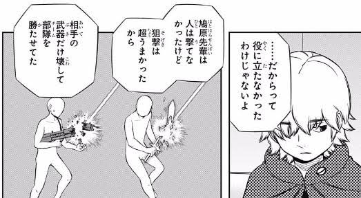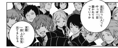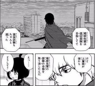 三輪がどう見ても未経験だから旧東隊は行ってないと思ってた A級1位の隊員だろうと連れていけない事はあるという状況を経験済みで、ついでに現A級1位にも連れてってもらえそうにない隊員がいて、「A級1位になって鳩原を連れていく」の無意味さが補強されていく