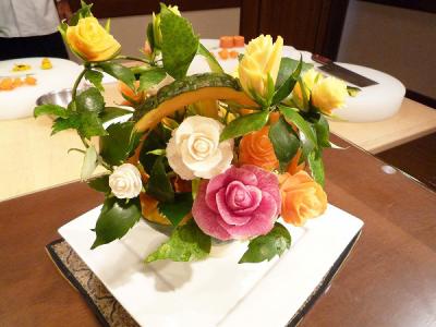 籠のかぼちゃは目の前で鍋で煮込むか、一度引っ込めた揚げ物とか?