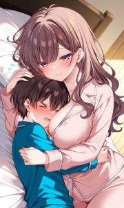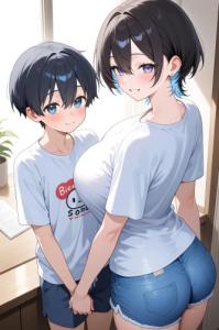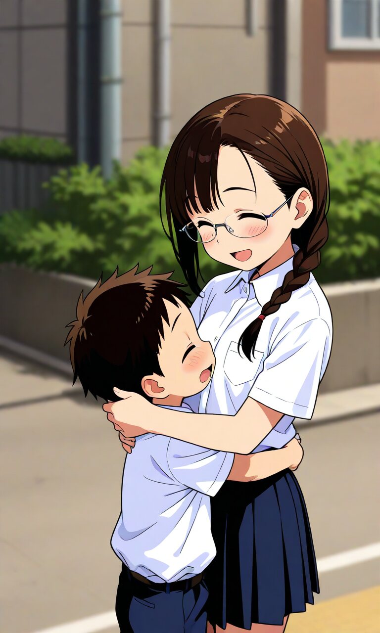 ショタとお姉さん、可愛いハグ、笑顔、健全、背の高いお姉さん(黒髪ロングヘア、白いTシャツ、大きめの胸、青デニム、)、BREAK 背の低いショタ(黒髪、ショートヘア、可愛い、水色のTシャーツ、半ズボン、小さなお尻)、明るい、温かい雰囲気、愛情、アニメ、
