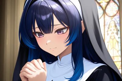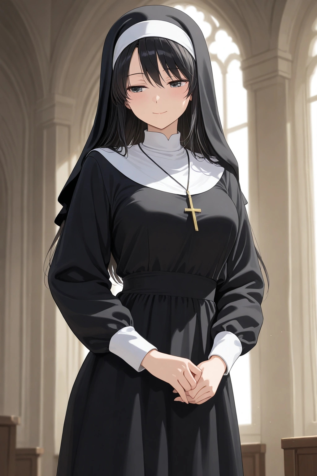 呪文:anime girl wearing a traditional nun outfit, modest clothing, black and white habit, cross necklace, serene expression, peaceful atmosphere, detailed fabric folds, soft lighting, clean lines, high quality, anime illustration