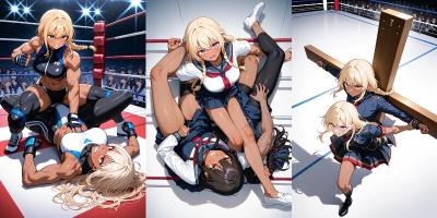 othergirl(柔軟な筋肉、金髪、ロングヘアー、絶望の顔)、苦しい顔、完璧な体、looking ahead 、十字固めを受ける、駆けよる審判、戦闘シーン、フルボディ、格闘リング、from above ダイナミック、高品質、8k