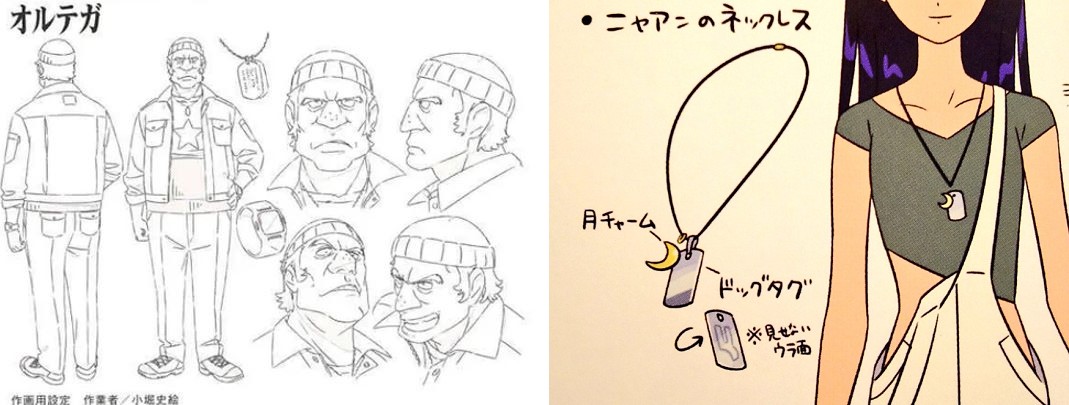 ・同じジオン公国軍人だったオルテガのドッグタグは主流の2枚式で認識番号が刻印されている事から正規軍人の表面はこれと同じはずだがニャアンのものの表面には識別番号が刻印されていない