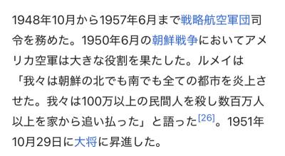 待てよ、二次大戦と朝鮮戦争に関してはルメイはあくまで現場責任者程度の立ち位置だから無差別爆撃に関しては全部コイツの責任って程じゃないんだぜ
