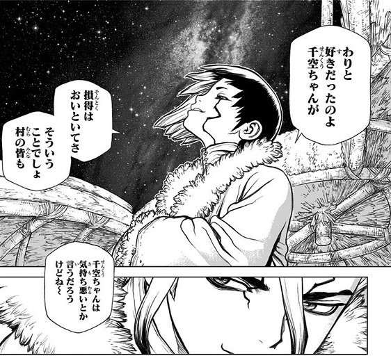 お前は雑に交渉系全部任されて人文系の千空と化してる…あと知識人枠の中ではタッパも器用さもあるからマンパワー要員にもされている…あと理系知識に関して常人目線でリアクションしてくれる…
