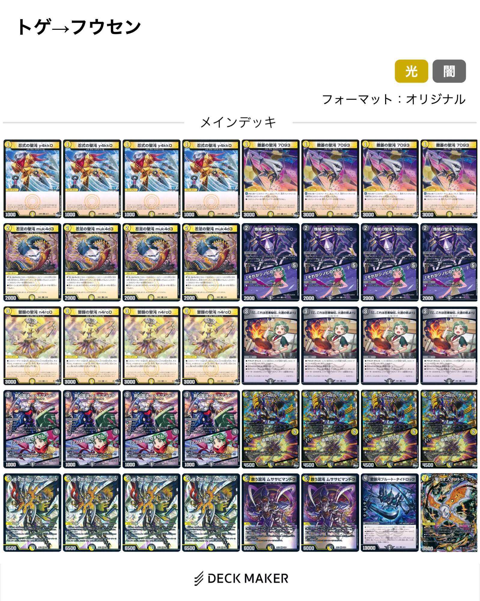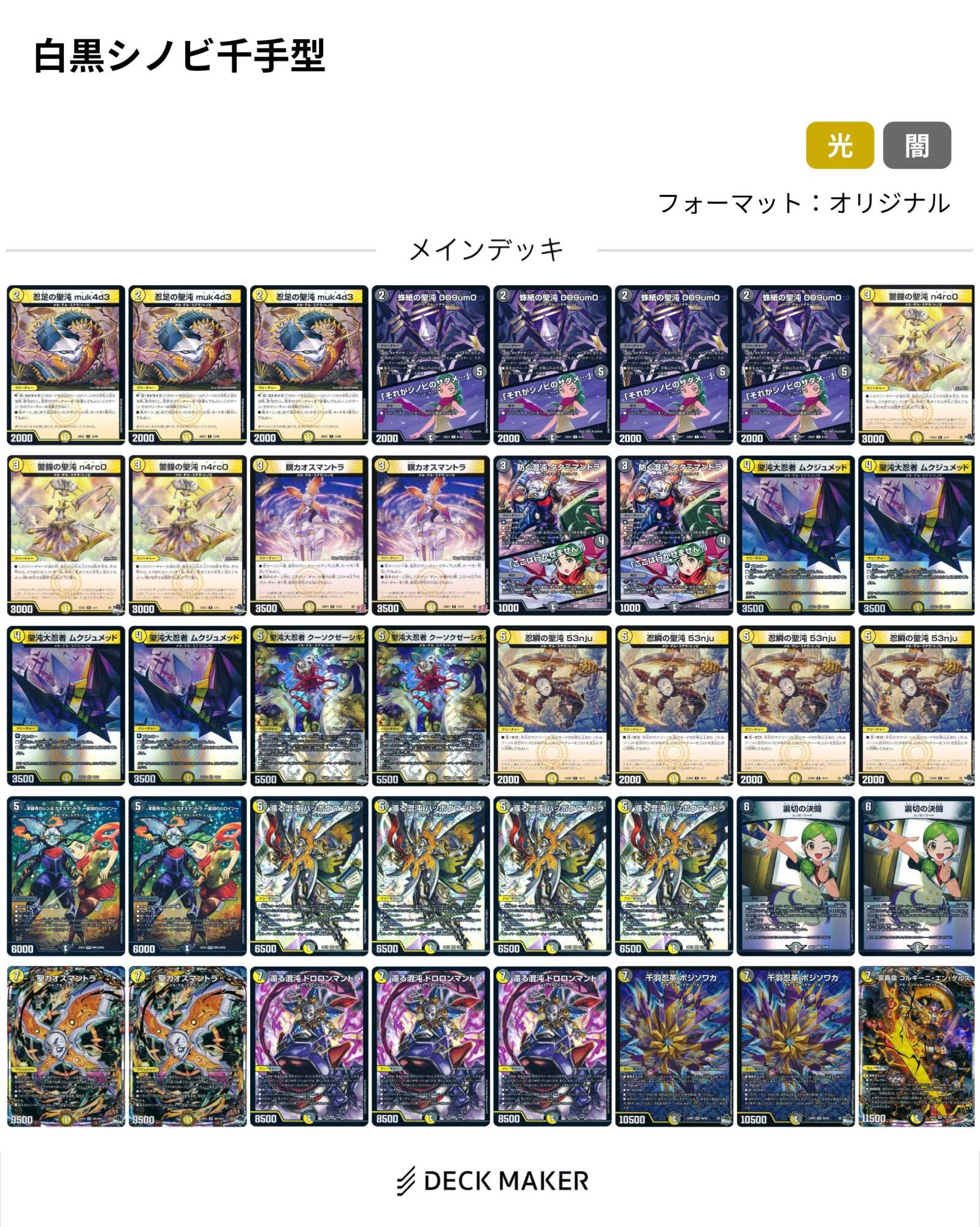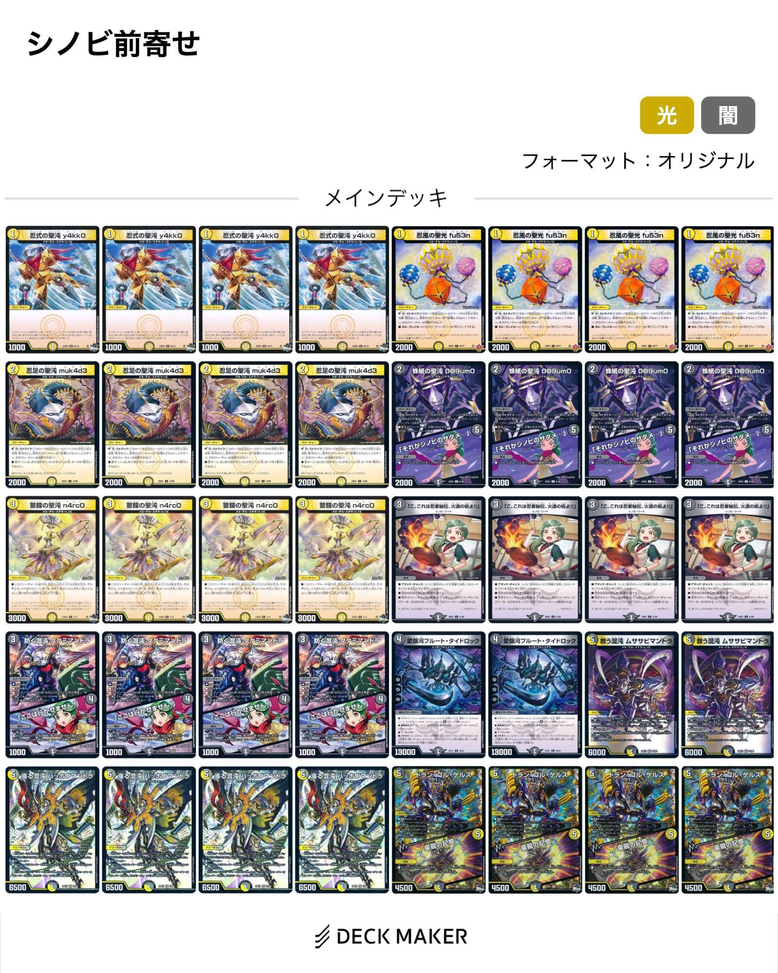 闇を最小限にしてセンジュを入れた光寄せにするのもありじゃねえかなと思うんだ、メタクリはシノビではないけどメカのヴェネラックがいるし2ターン目に5コストのメカシノビを立て易くなるからボジソワカやドロロンみたいな7コスチェンジ持ちを採用しやすくなるしなヌッ