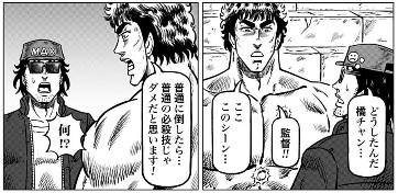 監督と橘チャン、トドメを百裂拳から有情拳に変えようって話し合いの時と30mピラミッドの方で崩壊シーン撮りたい!の時の言い合いの時でノリが全然違ってオモロい