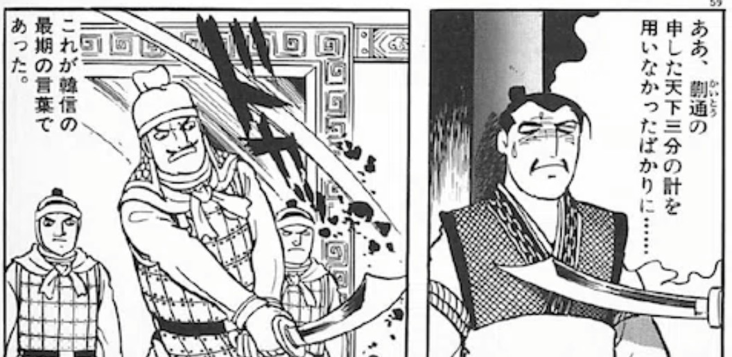 蒯通の言う通り斉取った時点で独立しとけばよかっただけのに変に恩義だのなんだの見栄張るからあんな末路になったのだと考えられる