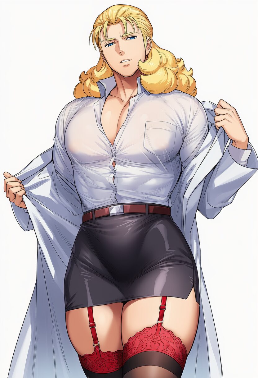 (赤いガーターストッキングの上に白衣を着たスケベドクターのフル・フロンタルください)