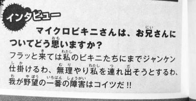 マイクロビキニの下僕の前髪の長い人:最初は催眠でした。でも今は心からお仕えしています。世界はマイクロビキニのもとに征服されるべきなのです。そのために我々ビキニ親衛隊は何一つ惜しむことはないでしょう。さあ、あなたも【マイクロビキニ親衛隊制服】