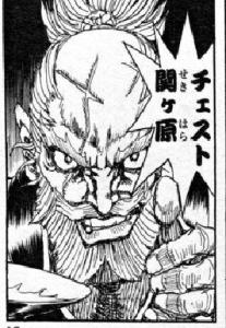 肩車して後ろ向きに乗り二本のゴボウを持った歌舞伎顔の男