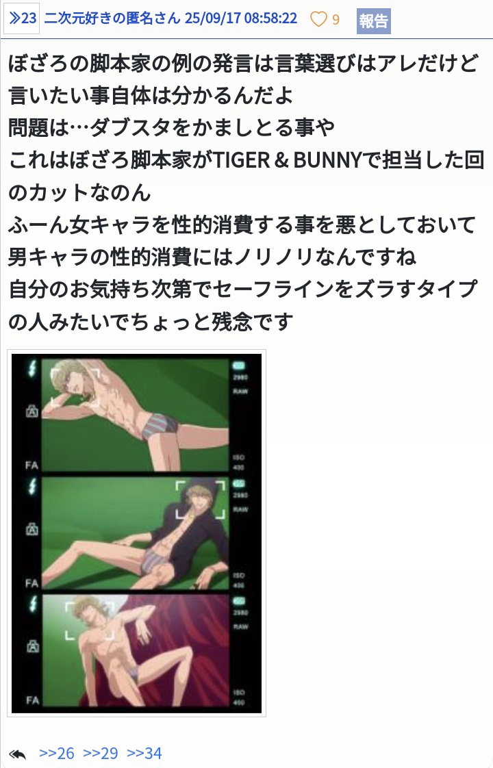 ワシも大好きだし当時も今もこの回に別に文句はないけどこれ書いといて性的消費云々言うなって意見はもちろんめちゃくちゃ賛同する - 34二次元好きの匿名さん25/09/17(水) 09:34:01