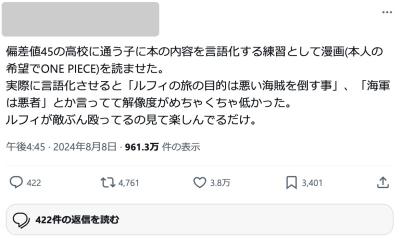 やれ「海軍は正義を掲げる資格はない」やら「天竜人の悪行に加担してるクズ集団」やらの意見見てるとこういう言い方はしたくないが読解力ない読者多すぎじゃねって思う