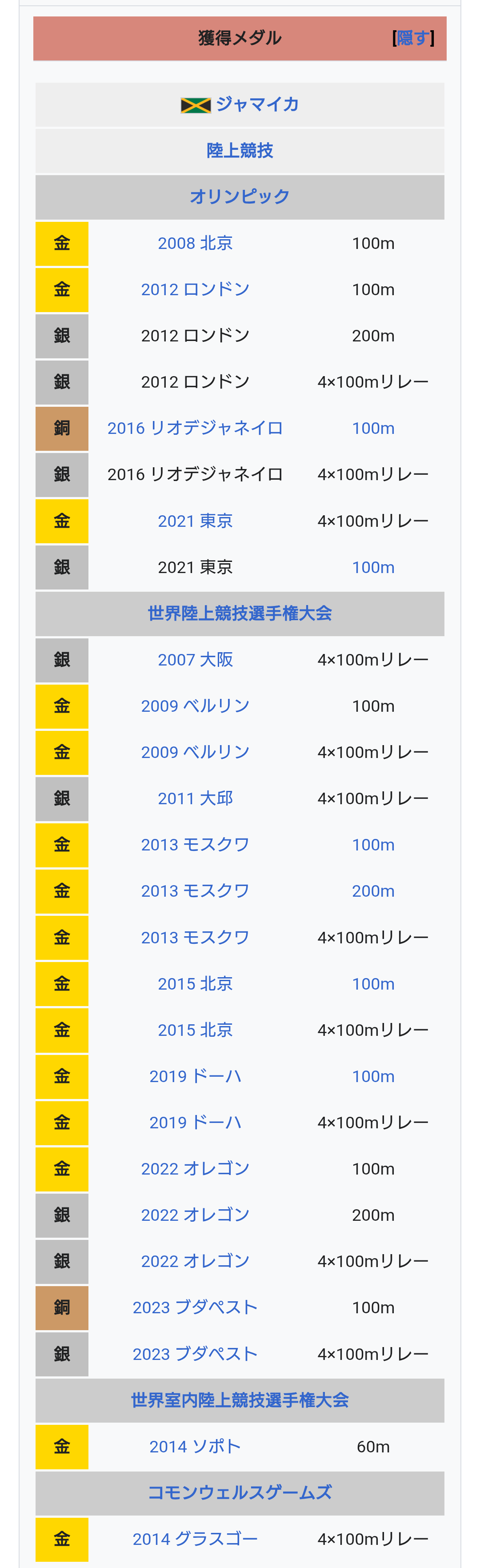 シェリー=アン・フレーザー=プライスかオリンピックで金メダル3枚取ってるしなんなら世界陸上に至っては金メダル10枚取ってて2013年モスクワ世界陸上では女子史上初の100m・200m・4×100mリレーの3冠を達成した怪物を超えた怪物だぞ