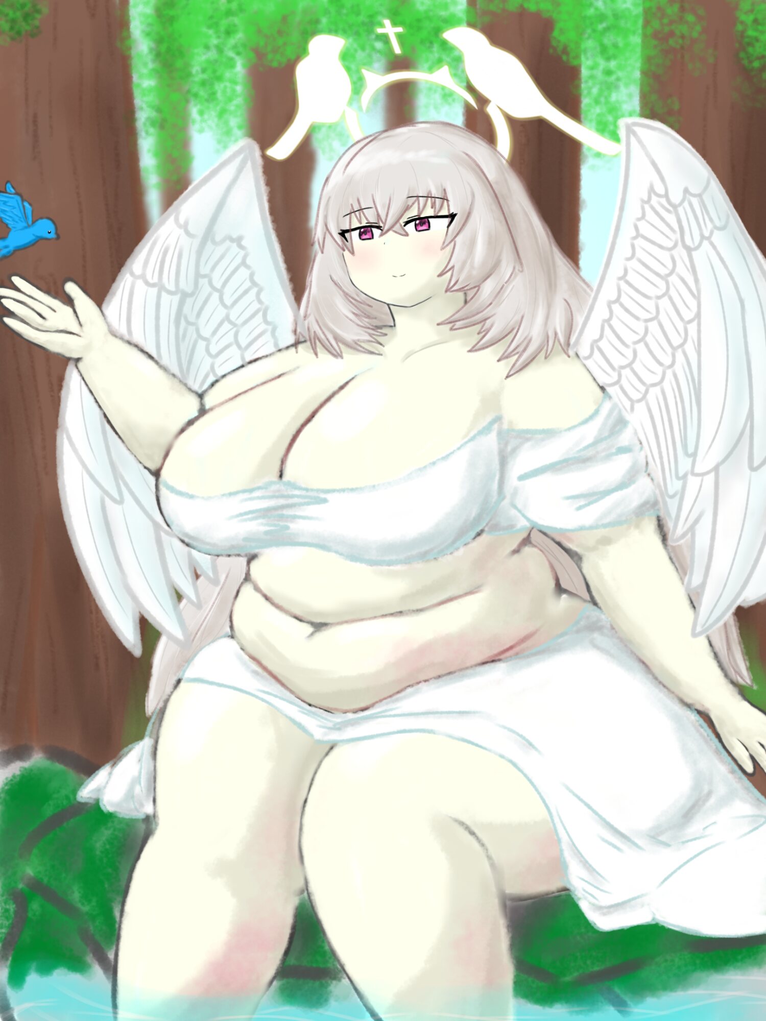 神々しい翼でも支え切れそうにはない巨体がセクシー……二の腕もぶっといのに手首辺りにまで肉が着いちゃってみちみちになってて可愛いね、赤ちゃんみたいに指にまで脂肪が着いてる手を鳥に差し出してるの可愛いね